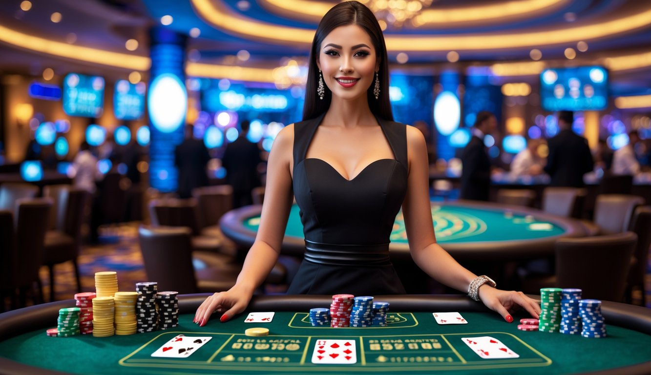 Seorang dealer wanita berdiri di belakang meja permainan kasino dengan kartu dan chip, dikelilingi oleh suasana kasino mewah dan pemain yang sedang bermain.