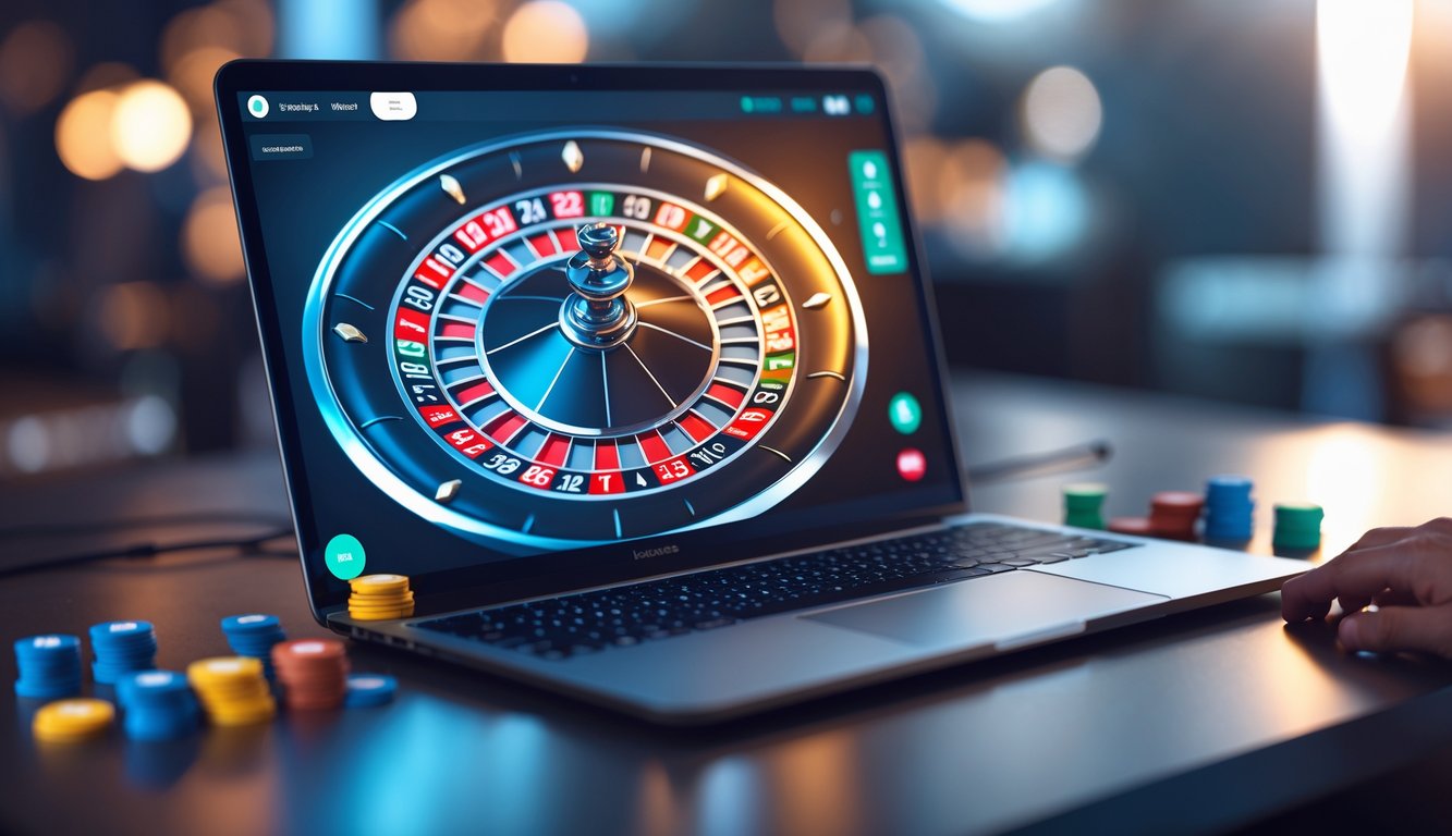 Sebuah layar komputer menampilkan permainan roulette online dengan roda roulette digital dan meja taruhan dengan chip.